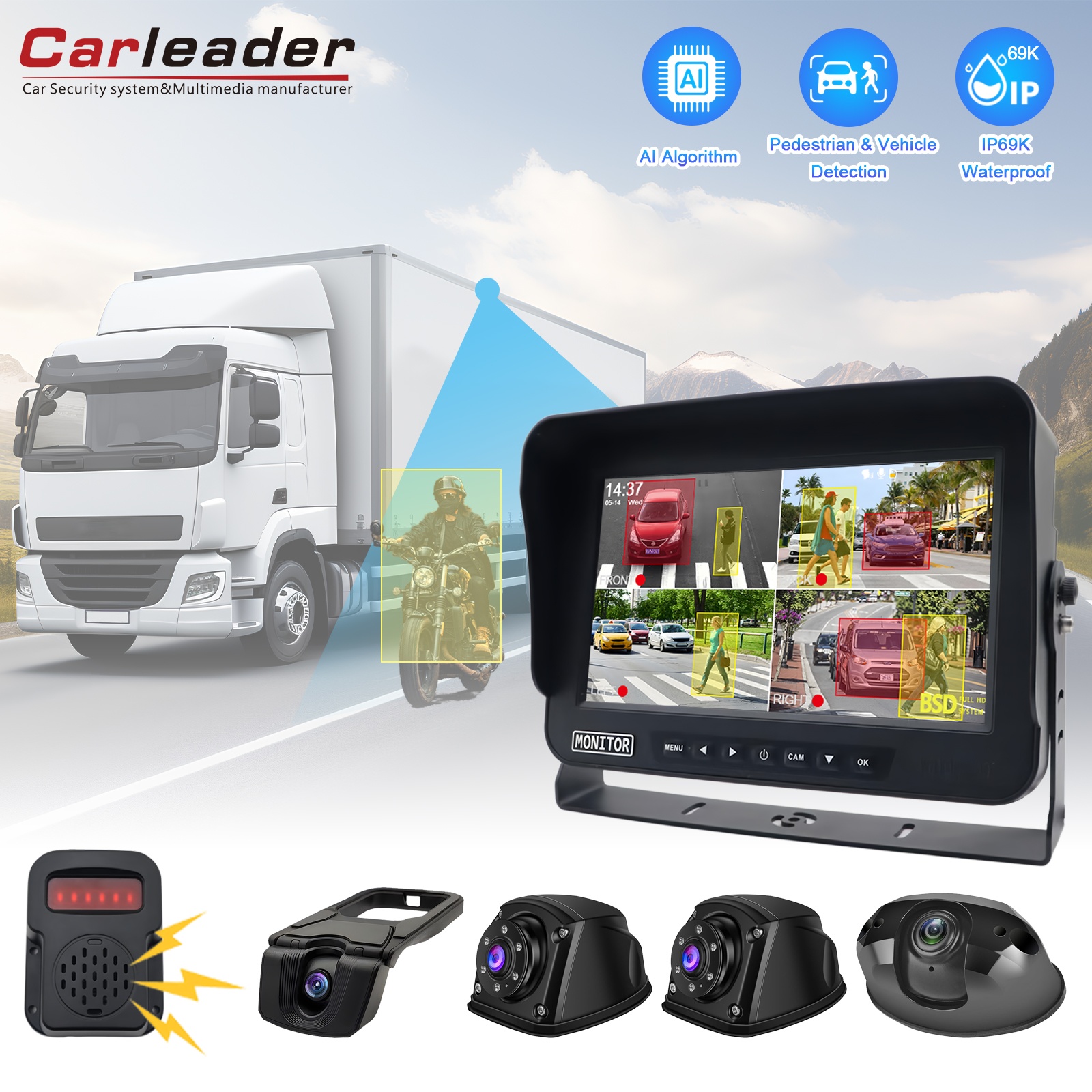 Carleader 10.1 hazbeteko ibilgailua BSD Blind Spot hautemateko sistema, kamioiak, autobusak, autoak adierazteko eta ibilgailu bereziak diseinatuta. AI irudi algoritmo aurreratuekin eta errendimendu handiko txip batez hornituta, sistema honek adimentsu antzematen ditu oinezkoak, txirrindulariak, motoak, furgonetak eta animaliak itsu-itsuan, tolesturak ekiditeko aditz puntualak emanez.