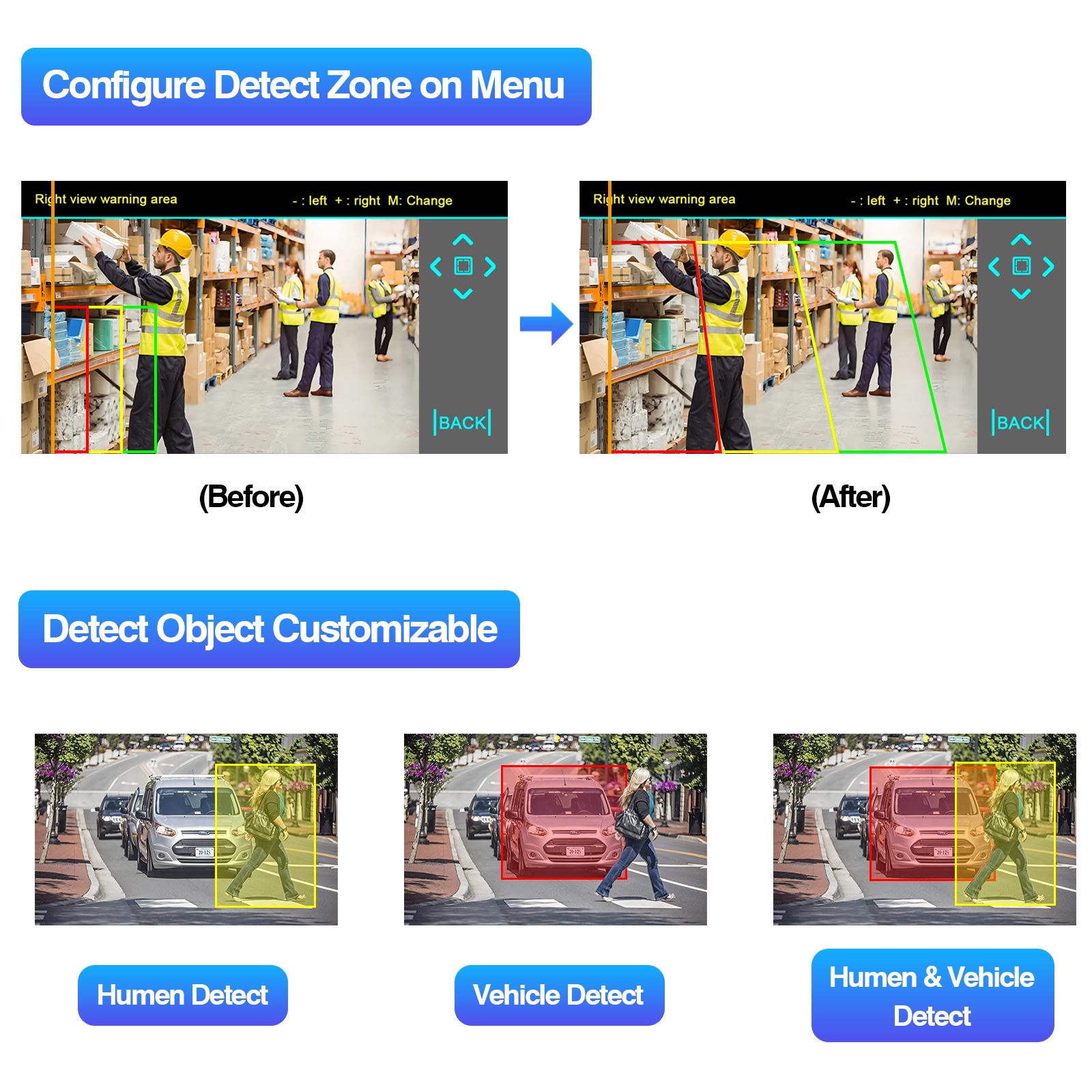 Detekzio adimenduna: denbora errealeko abisuak Zonalde itsuetan sartzen diren objektuetarako, AI funtzioaren kalibrazioa onartzen du, kalibrazio trapezuzko lerroen bidez erregulagarria (berdea abisu guneetarako, urdina ibilgailuen lurreko lerrokatzeko urdina).