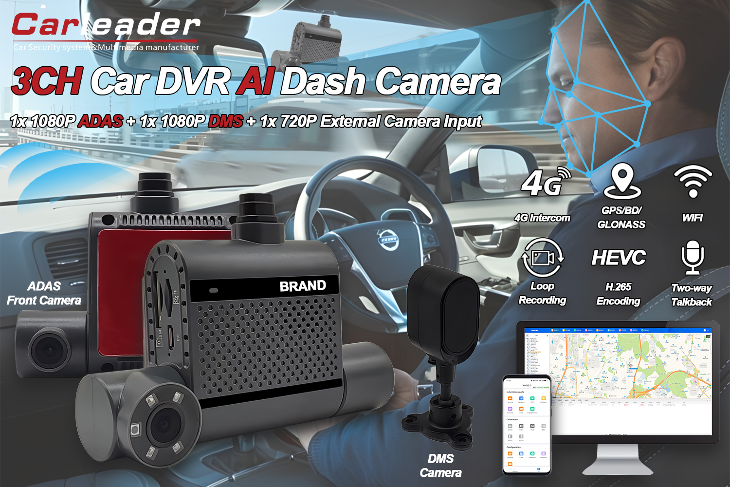 CARLEADER3 Channel Ai Dash CAM Adas eta DSM-rekinIdeala: Garraio Flotak, Ibilaldia, Logistika eta abar