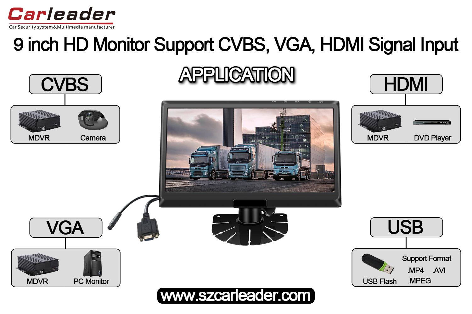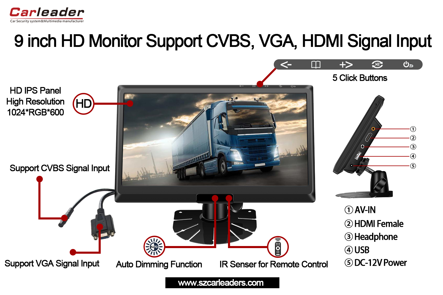 Carleader9 hazbeteko IPS pantaila HD monitorea CVBS + HD + VGA sarrerak onartzen dituErrendimendu handiko HD monitorea da ibilgailuen monitorizaziorako eta MDVR flota kudeatzeko diseinatua. Autoaren monitoreak CVBS, HD eta VGA seinale sarrerak onartzen ditu. Eta MDVRak VGA edo HD interfazea badu, 9 hazbeteko IPS pantailako autoko monitorearekin erabil daiteke.