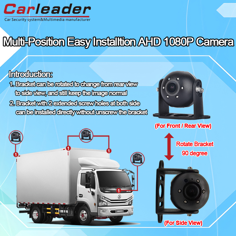 CarleaderAHD Ibilgailu Astuneko Aurrealdea / Alboko / Atzeko Bistarako Kamera euskarria instalatzeko zuloarekin gora, behera, eskuinera, ezkerrean, kamerari kameraren euskarria doitzeko aukera ematen dio kameraren posizio desberdinetara egokitzeko, hala nola aurrealdea, alboa eta atzeko ikuspegia, kamera hau bateragarriagoa bihurtzen du ibilgailuen segurtasunaren zaintza sistemarako.