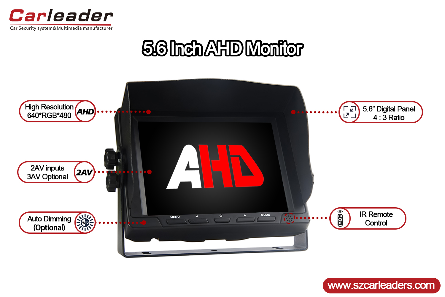 Carleader5,6 hazbeteko 2CH AHD Ibilgailuen babeskopia monitoreakamioi, autobus, autokarabana eta edozein ibilgailurentzat aproposa, non atzeko ikusgarritasuna eta segurtasuna hobetzea lehentasuna duten. Bere eraikuntza iraunkorrak, pantaila argiak eta ezaugarri praktikoak ibilgailuen kamera sistema modernoetarako osagai fidagarri bihurtzen dute.