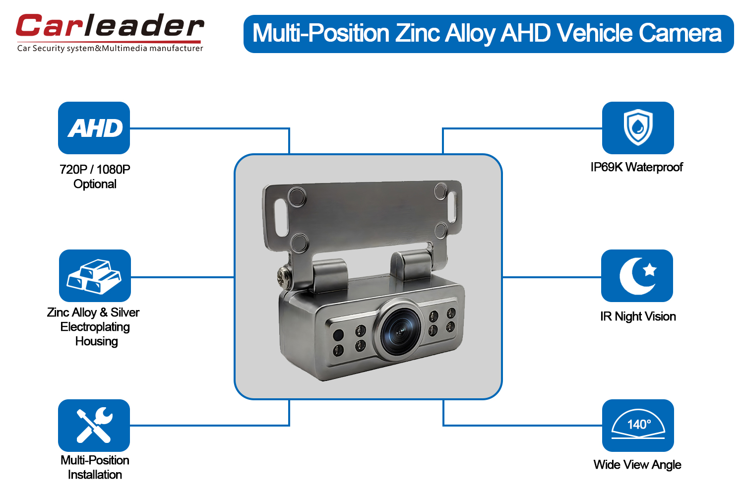 CarleaderAHD Zilarrezko Galvanizazioa Ibilgailuen Alderantzizko Kamera, zink aleazioko karkasa eta zilarrezko galvanoplastia, 140 graduko ikusmen angelu zabalarekin eta IP69K iragazgaitza eta hautsaren aurkakoa. Instalazio angelua eta posizioa torlojuen bidez ere finkatu daitezke.