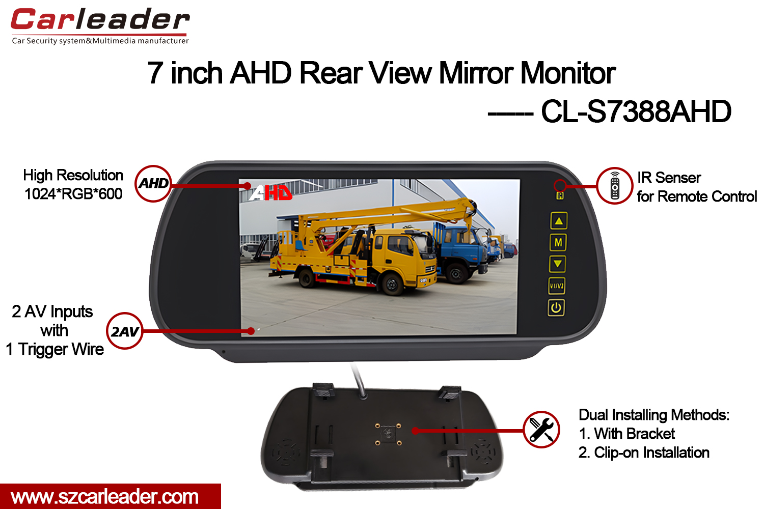 Carleader7 hazbeteko TFT LCD Atzeko Ispilua AHD MonitoreaErrendimendu handiko 7 hazbeteko autoen ispilu AHD monitorea da, ibilgailuen monitorizazio sistema modernoetarako argitasun eta aldakortasun aparta emateko diseinatua. Ezaugarri aurreratuak eta erabilerraza den diseinuarekin konbinatuz, monitore honek errendimendu fidagarria bermatzen du gidatzeko baldintza anitzetan.