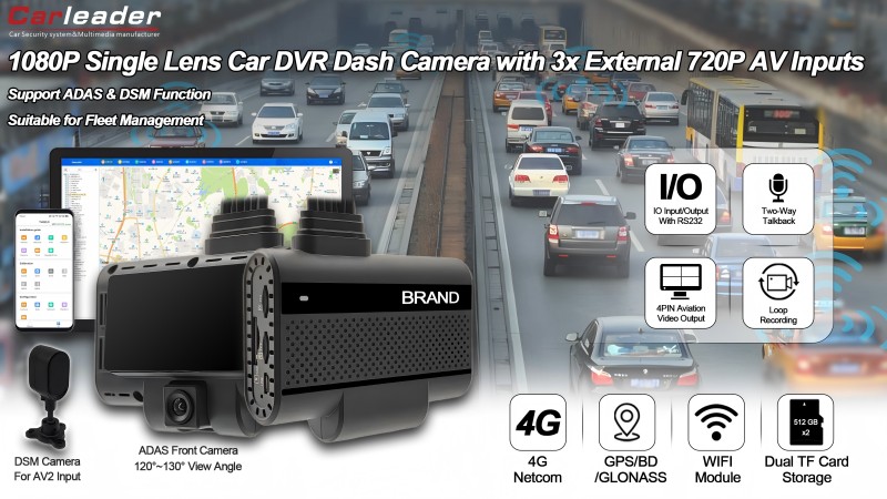 Carleader4CH AI Powered ADAS+DSM Dash Kamerak Bideo Irteera onartzen duerrendimendu handiko lente bakarreko DVR kamera bat da, ibilgailuen segurtasun eta monitorizazio beharretarako diseinatua. Gidariari laguntzeko sistema aurreratuekin (ADAS) eta gidariaren egoeraren monitorizazioarekin (DSM) hornituta, gailu honek segurtasun osoa eta denbora errealeko alertak eskaintzen ditu gidatzeko segurtasuna hobetzeko.